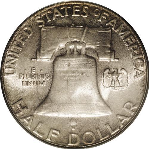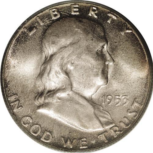 <B>1953<50C> MS66 Full Bell Lines PCGS.</B></I> Attractively toned with unusually clean surfaces and a bold, sharp strike. A small pinscratch is seen at the center of the Liberty Bell as the coin is turned under a light. A fully original, conditionally rare Franklin half. Population: 28 in 66, 0 finer (4/06).