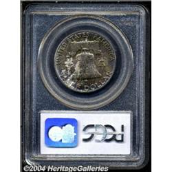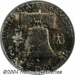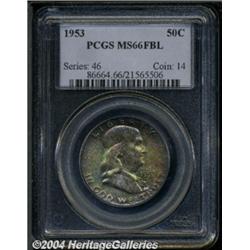 <B>1953<50C> MS66 Full Bell Lines PCGS.</B></I> Medium shades of red and emerald-green intermingle over the obverse, the reverse is slightly deeper in tone. This magnificent color is probably the result of being housed in a cardboard mint set holder for many years. Well struck with a single mentionable mark on Franklin's lower cheek. Population: 25 in 66, 0 finer (3/04). <BR><BR><B>Important notice:</B> Heritage usually auctions material at the rate of 200-250 lots per hour. On some occasions eBay Live bid software or the Internet may not be able to keep up with the pace of the auction. We recommend placing a realistic absentee bid now as insurance to avoid disappointment. Occasionally the auctioneer may eliminate or reject an eBay Live bid, and the auctioneer may also reopen a lot after the close of the eBay live bidding (usually because we missed an audience bid), and may reject your bid even if it shows you as the winning bidder. By bidding via eBay Live, you agree that Heritage may award the lot to another bidder at its sole discretion under the circumstances described above or any other reasonable circumstances. Since eBay bids are not shown to us until we open the lot on the floor, we treat those bids just like floor bids. In most cases the floor responds before the eBay bid is presented to us, due to Internet lag time, so for consistency we have made it a policy that floor bids are always considered first over tie eBay live bids. Also please note that all Heritage lots purchased through eBay Live carry a 20% Buyer's Premium. Please make sure you read the Terms and Conditions before you bid. </span></font></tr></table></td></tr></table>