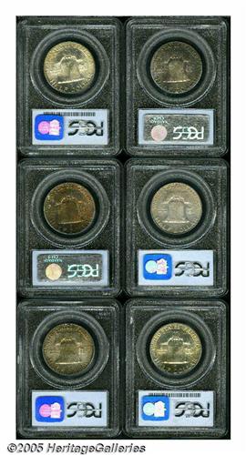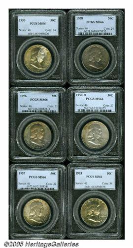 <B>1953<50C> MS66 PCGS,</B></I> variegated orange tonality with some slivers of silver and good eye appeal; <B>1956 MS66 PCGS,</B></I> green, violet and tangerine color and excellent preservation; <B>1957 MS66 PCGS,</B></I> powdery-crimson with an arc of rainbow on the lower obverse, some tiny marks, but clearly a superb-Gem; <B>1958 MS66 PCGS,</B></I> mottled violet, green and gold color, and nice underlying luster; <B>1959-D MS66 PCGS,</B></I> lovely matte-lavender color with golden peripheries, nice luster, and excellent surfaces; and a <B>1963 MS66 PCGS,</B></I> yellow-orange surfaces, excellent luster, and a better-than average strike.
