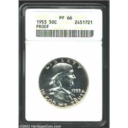 1953 50C PR66 ANACS. Dappled russet iridescence rings the peripheries of this otherwise untoned, silver-white Gem. Brilliant in finish, the surfaces are expectantly pristine for the PR66 grade level. Important notice: We expect to be auctioning lots at the rate of 200-250 per hour. Sometimes eBay Premier live bid software cannot keep up with that pace, so we strongly recommend that you place a realistic proxy bid now as insurance to avoid disappointment. Also please note that all Heritage/CAA lots purchased through eBay Premier carry a 20% Buyer's Premium. Please make sure you read the Terms and Conditions.