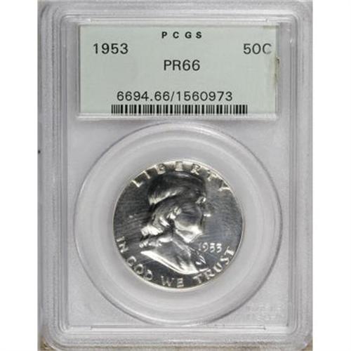 <B>1953 50C PR66 PCGS.</B></I> PCGS Population (638/204). NGC Census: (518/409). Mintage: 128,800. Numismedia Wsl. Price for NGC/PCGS coin in PR66: $200. (#6694)<BR><BR><B>Coin Engraver:</B> John R. Sinnock<BR><BR><b>Shipping:</b> Coins & Currency (<a target="_blank" href="http://www.heritageauctions.com/common/shipping.php">view shipping information</a>)