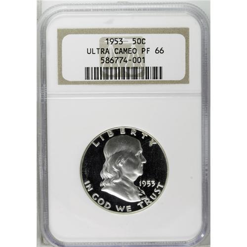 <B>1953 50C PR66 Ultra Cameo NGC.</B></I> A well struck Gem with seemingly unimprovable black-and-white contrast. A splendidly preserved specimen from the early, low-mintage years of the proof Franklin series. Census: 14 in 66 Ultra Cameo, 2 finer (10/06).<BR><BR><b>Shipping:</b> Coin/Currency (<a target="_blank" href="http://www.heritageauctions.com/common/shipping.php">view shipping information</a>)