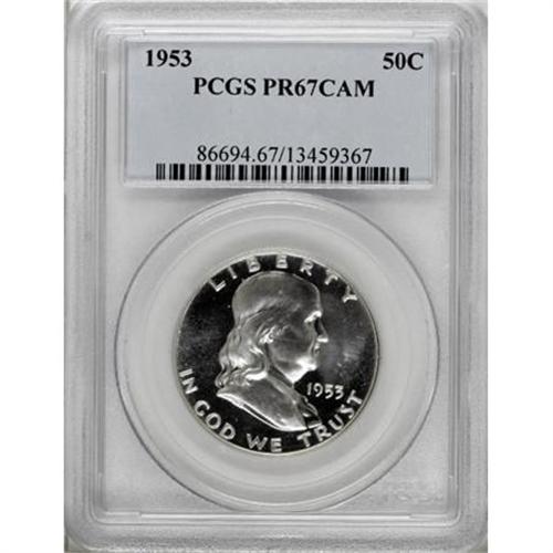 <B>1953 50C PR67 Cameo PCGS.</B></I> A gleaming Superb Gem survivor that offers distinct contrast on each side, though the cameo effect is stronger on the reverse. Small milk spots are noted at the top of Franklin's head and at several points near the bell.<BR><BR><b>Shipping:</b> Coins & Currency (<a target="_blank" href="http://www.heritageauctions.com/common/shipping.php">view shipping information</a>)