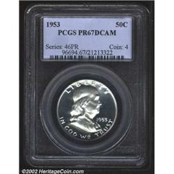 1953 50C PR67 Deep Cameo PCGS. A seemingly fully struck Superb Gem that has imposing black and white contrast. The surfaces are essentially as struck, but a small curly lintmark (as produced) at the top of the Liberty Bell will identify this lovely Franklin Half for future sales. Population: 6 in 67, 0 finer (7/02). Important notice: We expect to be auctioning lots at the rate of 200-250 per hour. Sometimes eBay Premier live bid software cannot keep up with that pace, so we strongly recommend that you place a realistic proxy bid now as insurance to avoid disappointment. Also please note that all Heritage/CAA lots purchased through eBay Premier carry a 20% Buyer's Premium. Please make sure you read the Terms and Conditions.
