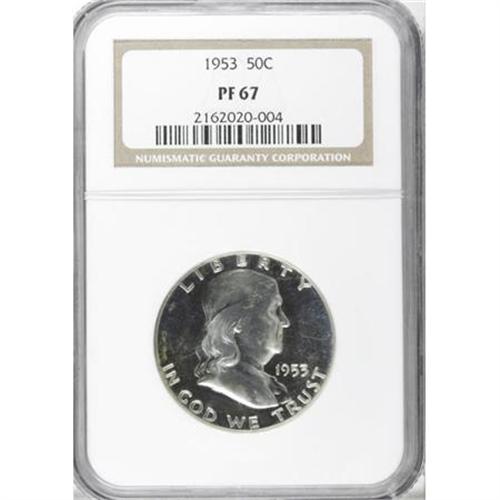 <B>1953 50C PR67 NGC.</B></I> NGC Census: (372/37). PCGS Population (193/11). Mintage: 128,800. Numismedia Wsl. Price for NGC/PCGS coin in PR67: $250. (#6694)<BR><BR><B>Coin Engraver:</B> John R. Sinnock<BR><BR><b>Shipping:</b> Coins & Currency (<a target="_blank" href="http://www.heritageauctions.com/common/shipping.php">view shipping information</a>)