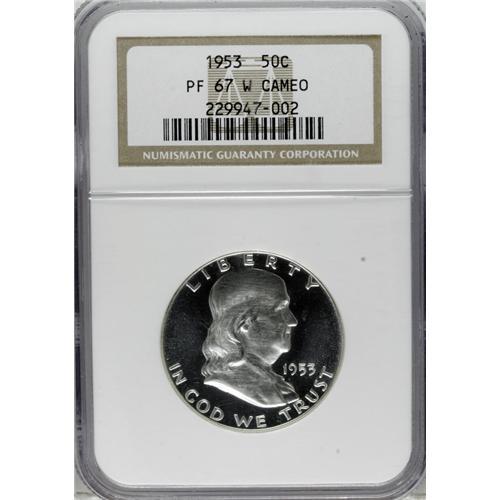 1953 50C PR67 W Cameo NGC. Most proof 1953 halves lack