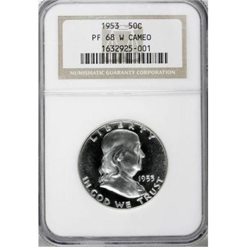 <B>1953 50C PR68 W Cameo NGC.</B></I> A brilliant and beautiful Superb Gem that features glassy fields and nicely frosted motifs. A good strike with only slight incompleteness at the centers. Portions of the eagle's wings are lapped away, as made and perhaps the inspiration for the higher relief Type Two reverse introduced in 1958.<BR><BR><b>Shipping:</b> Coins & Currency (<a target="_blank" href="http://www.heritageauctions.com/common/shipping.php">view shipping information</a>)