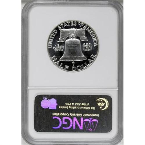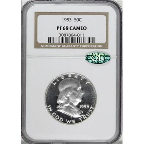 <B>1953 50C PR68 Cameo NGC. CAC.</B></I> This is one of the finest proof Franklin half dollars that we have seen recently. As evidenced by the "CAC" sticker, this piece is actually of premium quality for the lofty PR68 Cameo designation. A mere 20 coins have been certified at that grade level by NGC, and just one specimen has been encapsulated by the same company as PR68 Ultra Cameo, with none finer, as of (3/08). Fully struck and immaculately preserved, this Superb example displays dramatic contrast between the intensely frosted devices and the deeply mirrored, inky-black fields on each side. <BR><BR><b>Shipping:</b> Coins & Currency (<a target="_blank" href="http://www.heritageauctions.com/common/shipping.php">view shipping information</a>)
