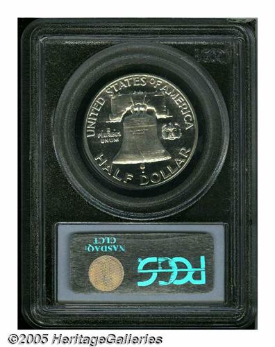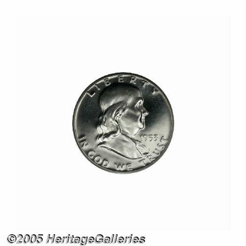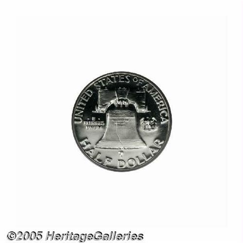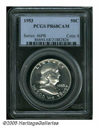<B>1953<50C> PR68 Cameo PCGS.</B></I> A starkly contrasted, snow-white Superb Gem that resembles a newly minted proof striking from half a century later. Those in search of a technically and aesthetically unsurpassable '53 proof Franklin need not look any further. Population: 3 in 68 Cameo, 0 finer (6/05).