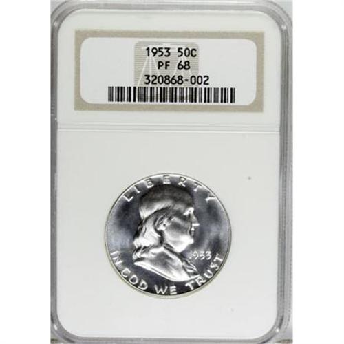 <B>1953 50C PR68 NGC.</B></I> NGC Census: (36/1). PCGS Population (10/1). Mintage: 128,800. Numismedia Wsl. Price for NGC/PCGS coin in PR68: $825. (#6694)<BR><BR><b>Shipping:</b> Coins & Currency (<a target="_blank" href="http://www.heritageauctions.com/common/shipping.php">view shipping information</a>)