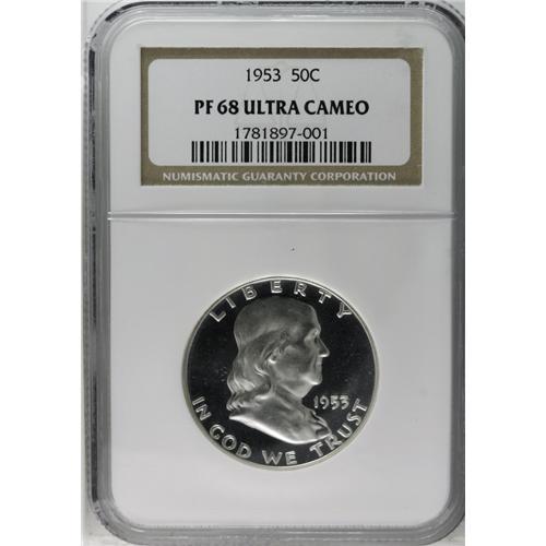 <B>1953<50C> PR68 Ultra Cameo NGC.</B></I> A masterful strike brings up the subtler design elements on each side of this Superb Gem Franklin half, the only PR68 Ultra Cameo (or Deep Cameo) of the 1950-1953 period. Even close inspection of the fragile proof surfaces, with the aid of a magnifier, fails to reveal a single noteworthy flaw. The snow-white central devices are beautifully contrasted against the background of jet-black, deeply reflective fields. This offering represents an exciting opportunity for the proof Franklin half specialist to acquire one of the finest specimens produced in the early 1950s. <BR><BR><B>Important notice:</