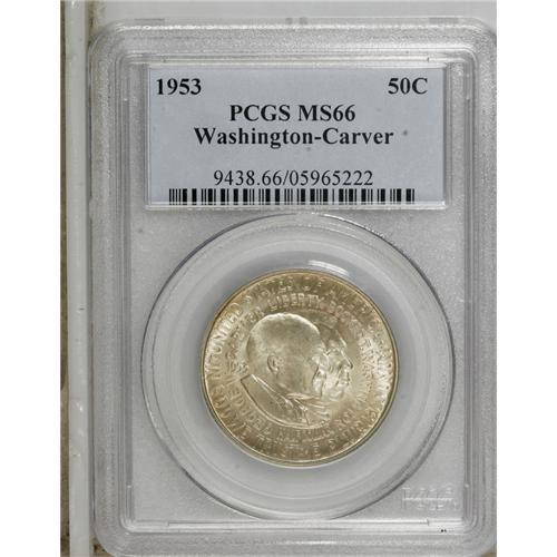 <B>1953 50C Washington-Carver MS66 PCGS.</B></I> Lustrous and well struck, this lovely Premium Gem is minimally marked on both sides. Pleasing green-gray toning adorns the shimmering surfaces. Population: 28 in 66, 0 finer (2/07).<BR><BR><b>Shipping:</b> Coins & Currency (<a target="_blank" href="http://www.heritageauctions.com/common/shipping.php">view shipping information</a>)