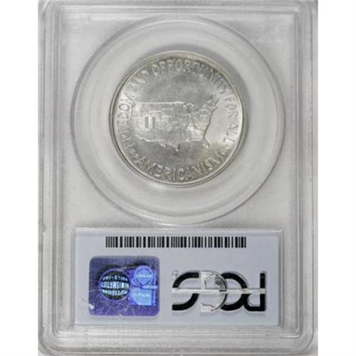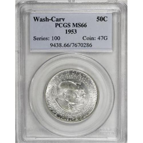 <B>1953 50C Washington-Carver MS66 PCGS.</B></I> Delicate powder-blue patina graces the margins of this strongly lustrous Washington-Carver example. Pleasingly detailed with only one flaw of note, a lone abrasion below California on the reverse. Neither NGC nor PCGS has certified a numerically finer representative (9/07).<BR><I>From The Sterling Collection.</B></I><BR><BR><b>Shipping:</b> Coins & Currency (<a target="_blank" href="http://www.heritageauctions.com/common/shipping.php">view shipping information</a>)