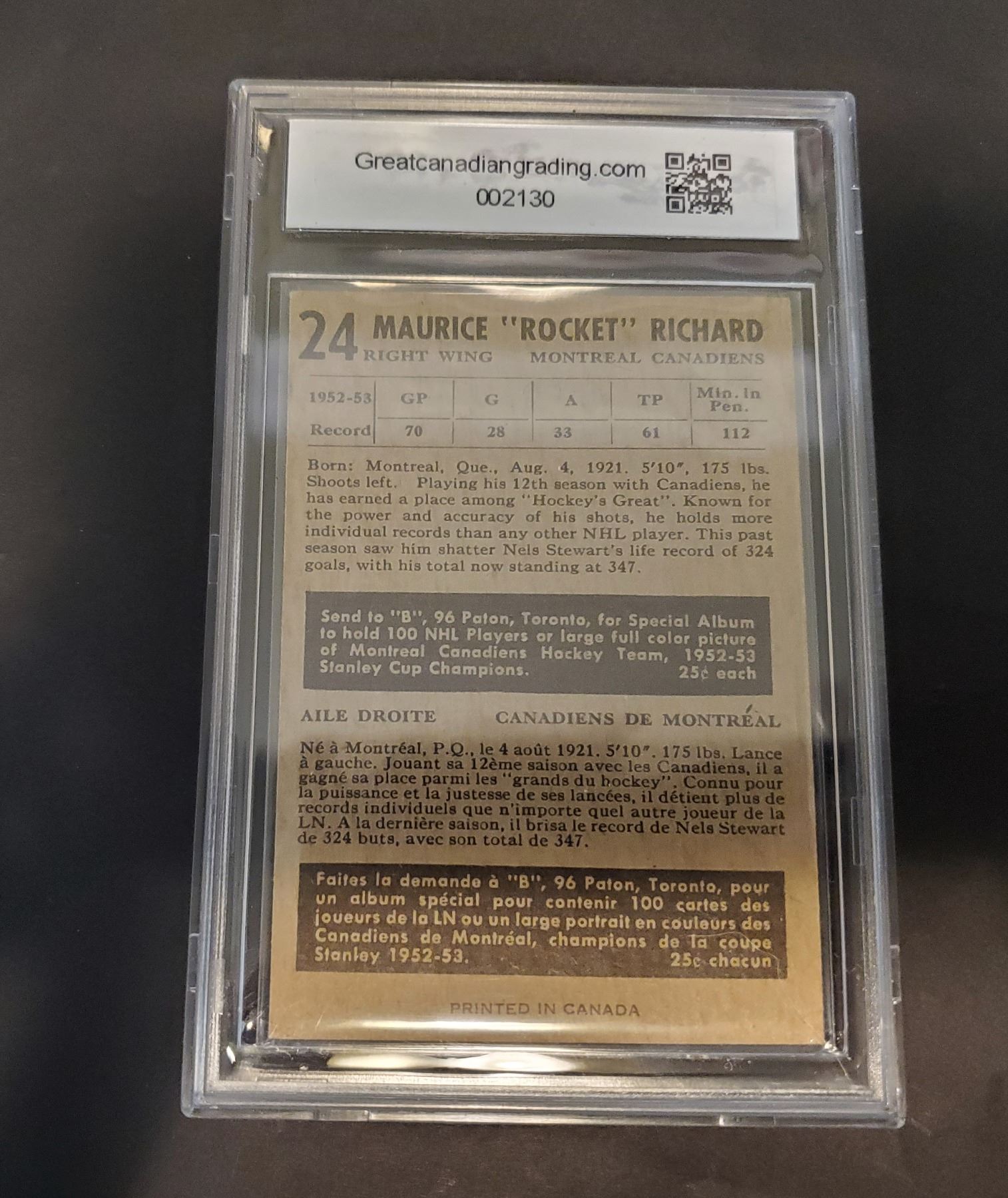 GCG graded 4 (VG/EX), ever popular Rocket Richard card, with a great low reserve of $250! Beckett lists the graded 4 value closer to $700. Is a lesser known Canadian grader worth that much less? Will anybody dig into our auction and find this hidden opportunity 94 lots in? Tune in on Friday June 3rd to find out :)