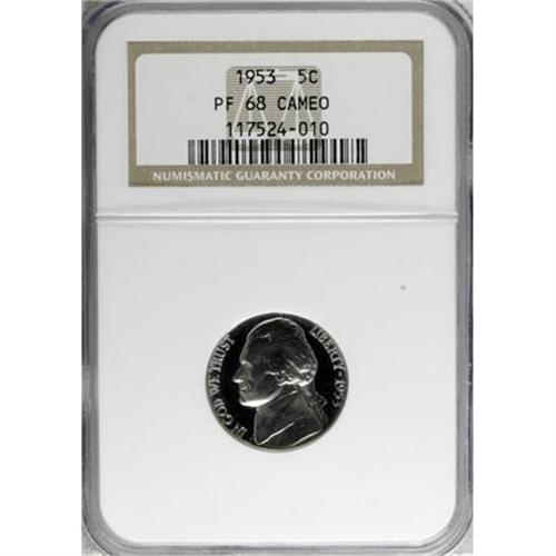 <B>1953 5C PR68 Cameo NGC.</B></I> NGC Census: (75/12). PCGS Population (31/1). Numismedia Wsl. Price for NGC/PCGS coin in PR68: $600. (#84185)<BR><BR><b>Shipping:</b> Coins & Currency (<a target="_blank" href="http://www.heritageauctions.com/common/shipping.php">view shipping information</a>\)