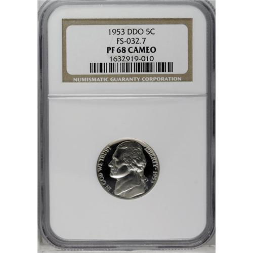 <B>1953<5C>--Doubled Die Obverse--PR68 Cameo NGC.</B></I> FS-032.7. A fully struck specimen with icy devices and darkly mirrored fields. IN GOD WE TRUST is die doubled toward the rim. An essentially immaculate example of this collectible DDO error.
