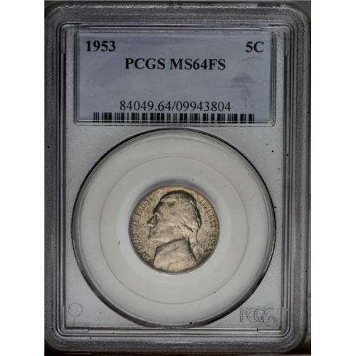 <B>1953<5C> MS64 Full Steps PCGS.</B></I> One of the poorest produced of the P-mint Jeffersons, as is quickly evident by its minuscule full steps population. The obverse of this Choice example displays light, speckled toning and the strike, while not perfectly executed, is particularly sharp on the steps of Jefferson's Virginia home. Population: 6 in 64, 6 finer (3/06). <BR><BR><B>Important notice:</B> Heritage usually auctions material at the rate of 200-250 lots per hour. On some occasions eBay Live bid software or the Internet may not be able to keep up with the pace of the auction. We recommend placing a realistic absentee bid now as insurance to avoid disappointment. Occasionally the auctioneer may eliminate or reject an eBay Live bid, and the auctioneer may also reopen a lot after the close of the eBay live bidding (usually because we missed an audience bid), and may reject your bid even if it shows you as the winning bidder. By bidding via eBay Live, you agree that Heritage may award the lot to another bidder at its sole discretion under the circumstances described above or any other reasonable circumstances. Since eBay bids are not shown to us until we open the lot on the floor, we treat those bids just like floor bids. In most cases the floor responds before the eBay bid is presented to us, due to Internet lag time, so for consistency we have made it a policy that floor bids are always considered first over tie eBay live bids. Also please note that all Heritage lots purchased through eBay Live carry a 20% Buyer's Premium. Please make sure you read the Terms and Conditions before you bid. This lot is being auctioned in conjunction with a live floor auction by Heritage Galleries & Auctioneers. All final auction and invoice information will be supplied by Heritage Galleries & Auctioneers, and all other information should be considered preliminary. Lot:1169 <BR><BR><B>Winning Notification and Billing:</B> After the FINAL session in this auction is complete, Heritage will send e-mail and snail mail invoices. This process normally takes several days. All final auction and invoice information will be supplied by Heritage Galleries & Auctioneers, and all other information should be considered preliminary. <BR><BR>This auction will be conducted on a live auction floor and over the Internet through eBay Live. If you choose to place an absentee bid, please take a moment to <font color='#0000ff'><u><a href='http://pages.ebay.com/liveauctions/help/before/laabsentee.html'>learn how eBay Live absentee bidding works</a></u></font><font color='#000000'>