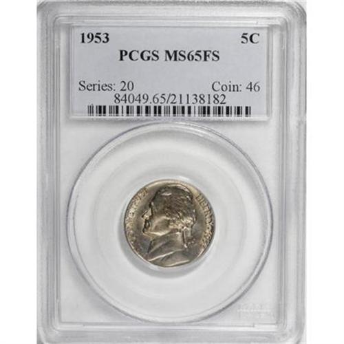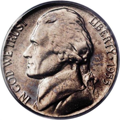 <B>1953 5C MS65 Full Steps PCGS.</B></I> Dappled pastel toning runs over both sides of this lustrous Gem, taking on sky-blue and olive-green hues on the obverse, and olive-green on the reverse. A well directed strike imparts good definition to all of the design elements, culminating in Full Steps on Monticello. A few minute marks do not disturb. Population: 6 in 65 Full Steps, 0 finer (8/07).<BR><BR><b>Shipping:</b> Coins & Currency (<a target="_blank" href="http://www.heritageauctions.com/common/shipping.php">view shipping information</a>)