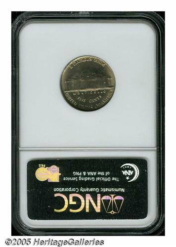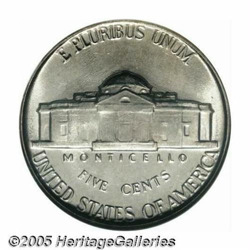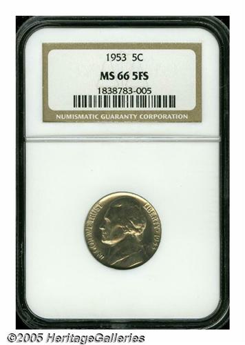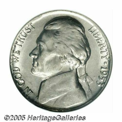 <B>1953<5C> MS66 Five Full Steps NGC.</B></I> Gentle apricot and cream-gray color adorns this shimmering and well preserved premium Gem. An interesting mint-made clash mark is encountered behind Jefferson's ponytail. NGC has not graded any 1953 Nickel as Six Full Steps, and as of (4/05), only the present coin has received a Five Full Step designation from NGC. PCGS has not certified any Full Step pieces above the MS65 level.