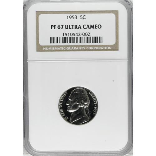 <B>1953 5C PR67 Ultra Cameo NGC.</B></I> Jefferson and Monticello are blast-white, and favorably contrast with the impeccably preserved and glassy fields. A magnificent specimen for the 1950s Ultra Cameo specialist. Census: 2 in 67, 6 finer (3/07).<BR><BR><b>Shipping:</b> Coins & Currency (<a target="_blank" href="http://www.heritageauctions.com/common/shipping.php">view shipping information</a>)