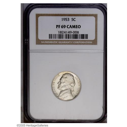 <B>1953<5C> PR69 Cameo NGC.</B></I> The 1953 is a scarcer Nickel with cameo contrast, especially lightly toned and in high grades. The fields are deeply reflective and there is a significant amount of mint frost on the devices, which yields a noticeable cameo contrast on each side. Intricately struck and impressive. Population: 11 in 69 Cameo, none are finer (9/05).
