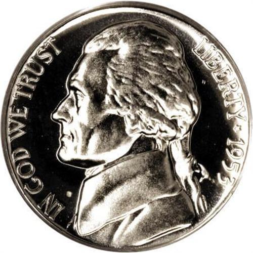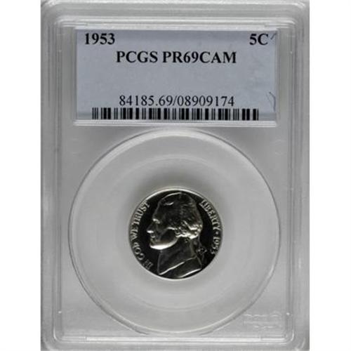 <B>1953 5C PR69 Cameo PCGS.</B></I> A truly rare coin for two reasons, contrast and condition. Although most proof 1953 Jefferson nickels show little contrast, they can be found on occasion with moderate cameo contrast, as on the present example. In terms of condition, precious few Jefferson nickels have survived more than 50 years in the seemingly completely pristine state of this piece. Extensive perusal under a glass reveals only some metal flowlines below N G of the motto, as struck, with no post-strike evidence of any kind. The single finest Cameo example at PCGS (6/07).<BR><BR><b>Shipping:</b> Coins & Currency (<a target="_blank" href="http://www.heritageauctions.com/common/shipping.php">view shipping information</a>\)