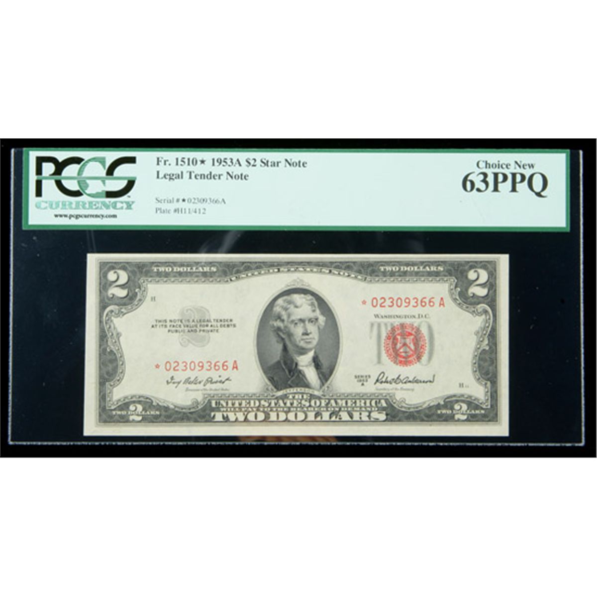 1953-A, $2 Legal Tender Note. Star Note. PCGS Choice New 63PPQ. . Fr-1510*. Centering is the only flaw, as both the face and back are shifted slightly high.