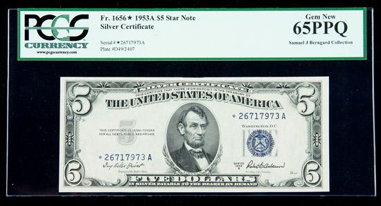 1953-A, $5 Silver Certificate. Star Note. PCGS Gem New 65PPQ. . Fr-1656*. A beautiful Gem example with bold embossing and excellent paper quality, a star note that is increasingly difficult to locate in top grades.