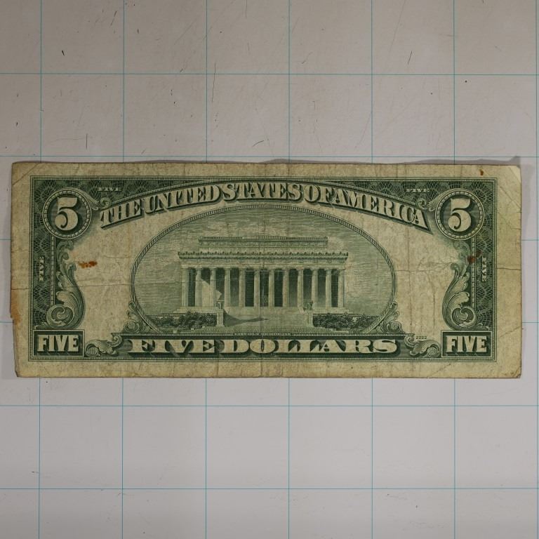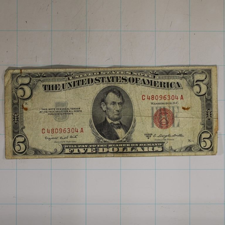1953-A US $5 RED SEAL NOTE SOME STAINS NOTED