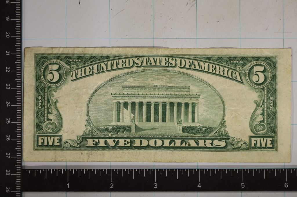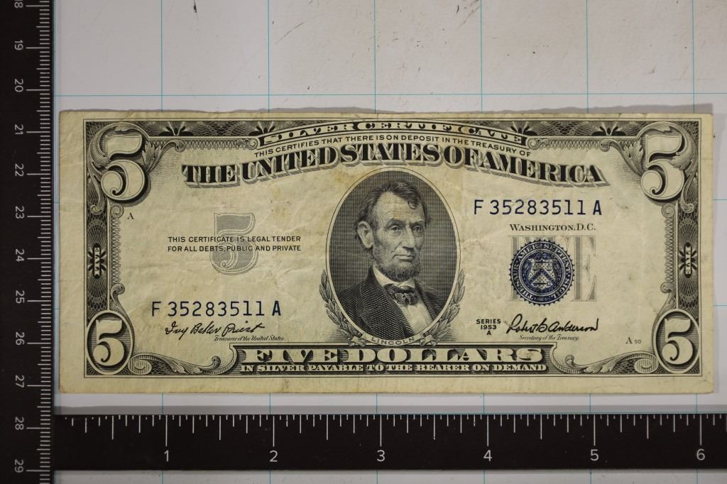 1953-A US $5 SILVER CERT, BLUE SEAL.