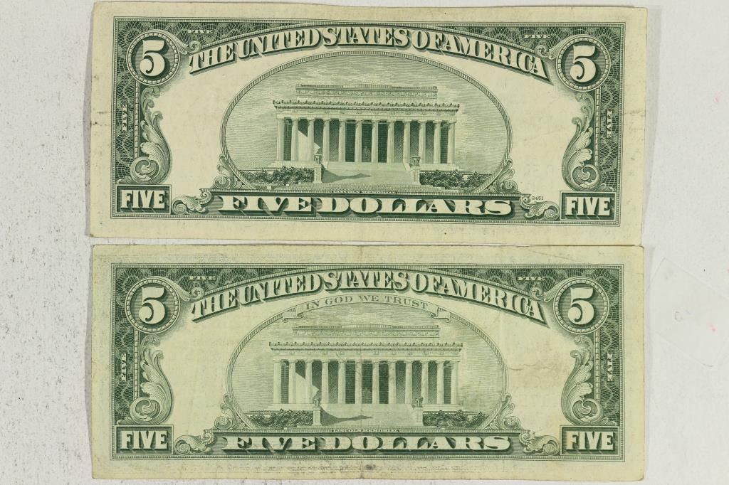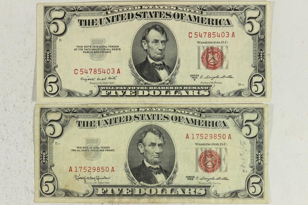 1953-B & 1963 $5 US NOTES RED SEALS