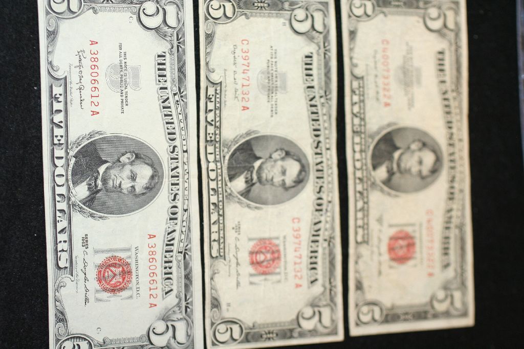 1953-B (2) & 1963 United States Note $5; Red Seal; Lot of 3
