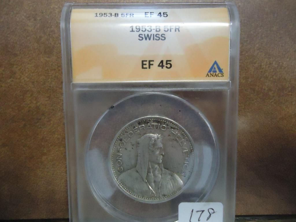 1953-B SWISS SILVER 5 FRANC ANACS (EF45)