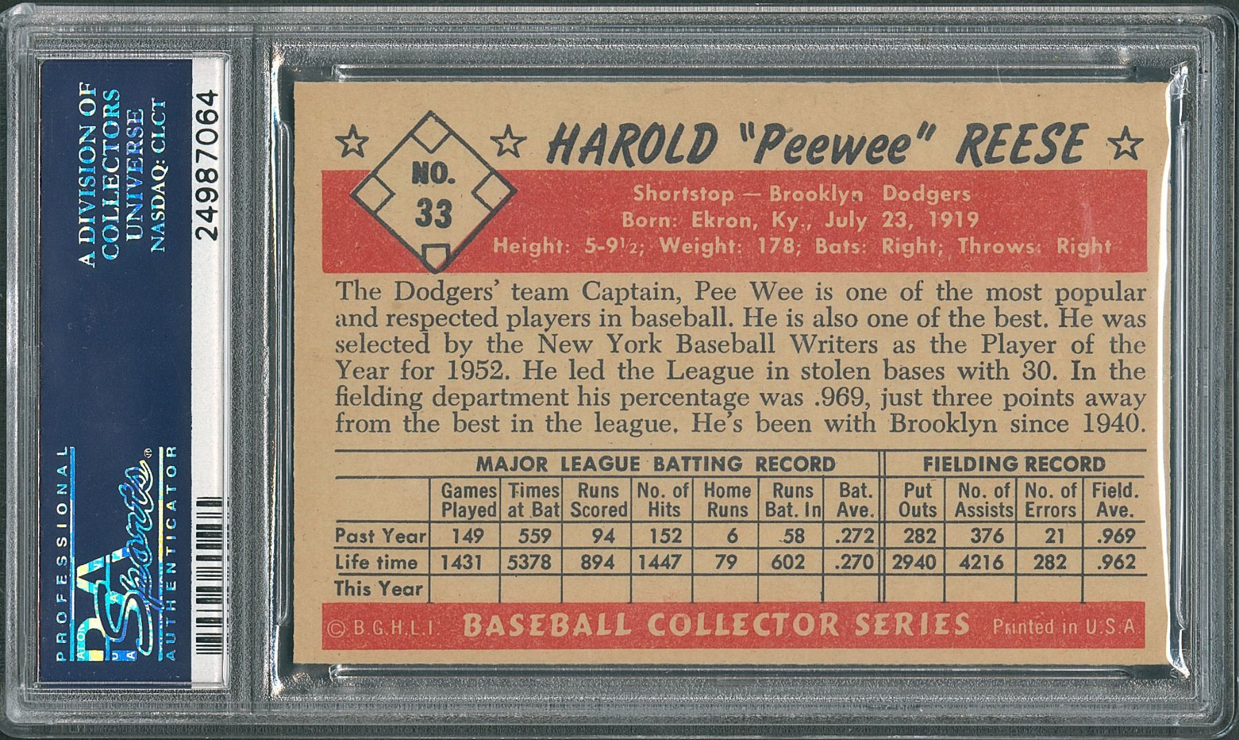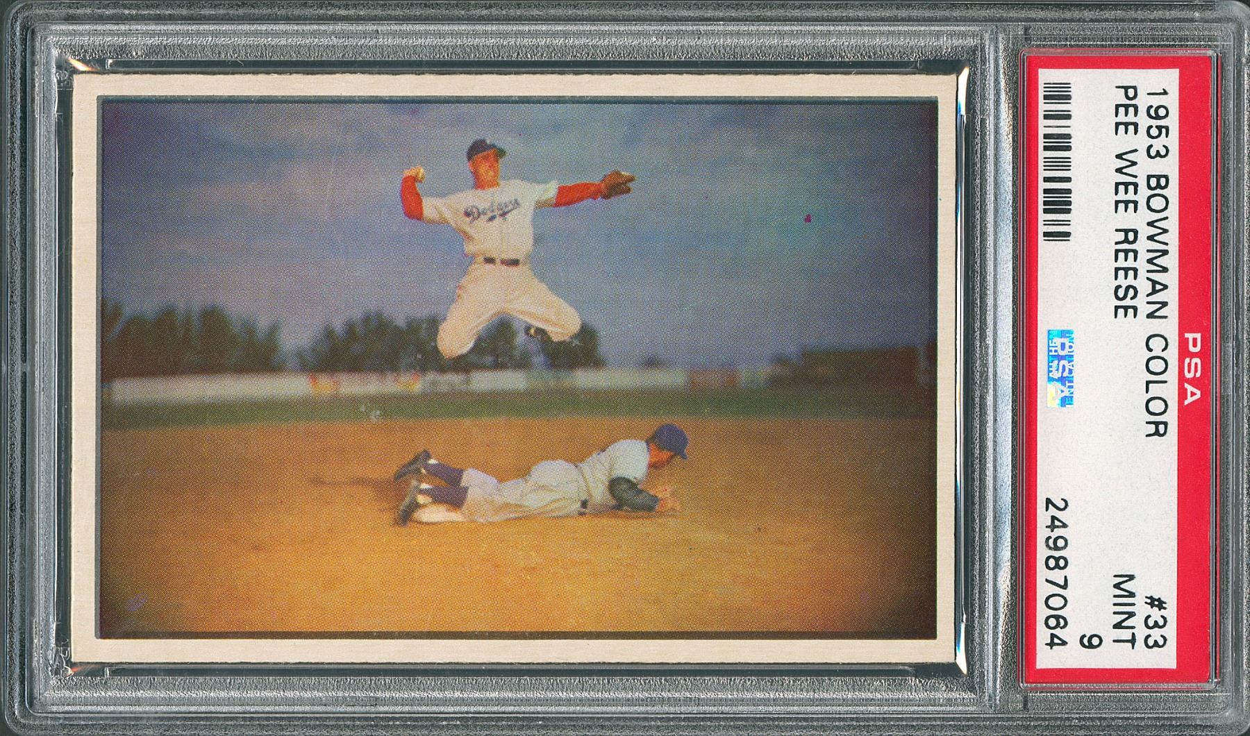 Graded by PSA MINT 9. The 1953 Bowman Color set is considered one of the most beautiful modern-era sets of baseball cards ever produced. Full color Kodachrome photos and an uncluttered obverse without any team name, emblems or markings are a simple design unseen in any other issues of the time period. It was the first time full color real photos were used for a current player card set. One of the most popular cards in the issue is the horizontal format card of #33 Pee Wee Reese, a unique image with Reese in mid air completing a double play. This example is graded by PSA MINT 9, with only one example grading higher. A key condition determining factor for this card is centering, as most examples are found off center. This card has superbly even borders, four sharp corners, and brilliant color. The reverse is also flawless with solid print and is unblemished. A collector will be hard-pressed to find a nicer example.