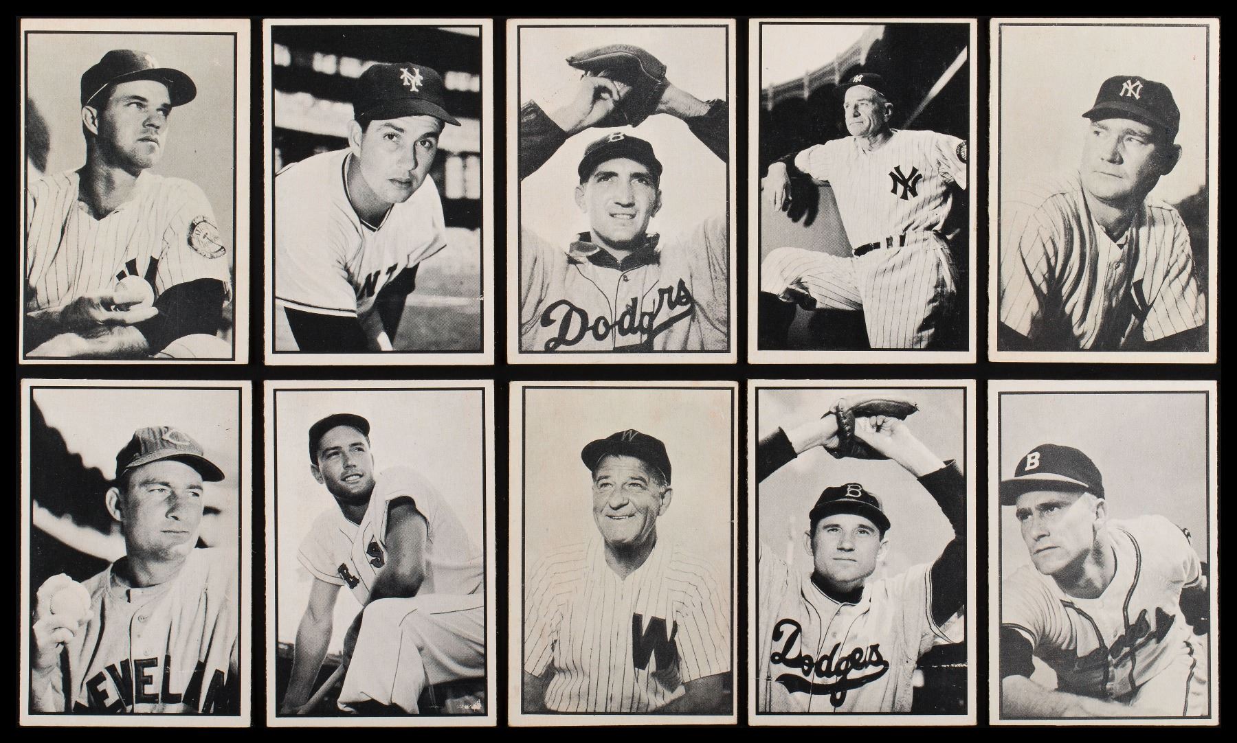Complete set of 64 cards, much tougher to locate than the 1953 Color cards. Includes: 1 Bell (EX), 15 Mize (VG), 25 Sain (VG/EX), 26 Roe (EX, paper loss front), 27 Lemon (EX), 28 Wilhelm (EX, paper loss front), 31 Woodling (NM), 36 Piersall (EX, paper loss front), 39 Stengel (EX, miscut reverse), 46 Harris (GD/VG), 51 Burdette (NM), 52 Branca (VG/EX) and 64 Hansen (VG). Grades 10% NM, 60% EX to EX/MT, 30% lesser (10% with paper loss).