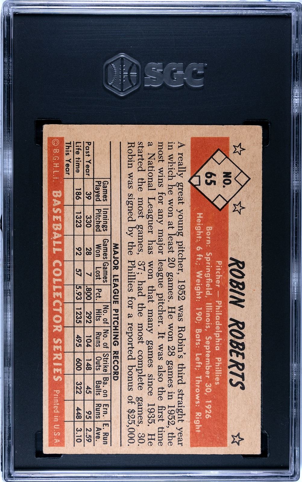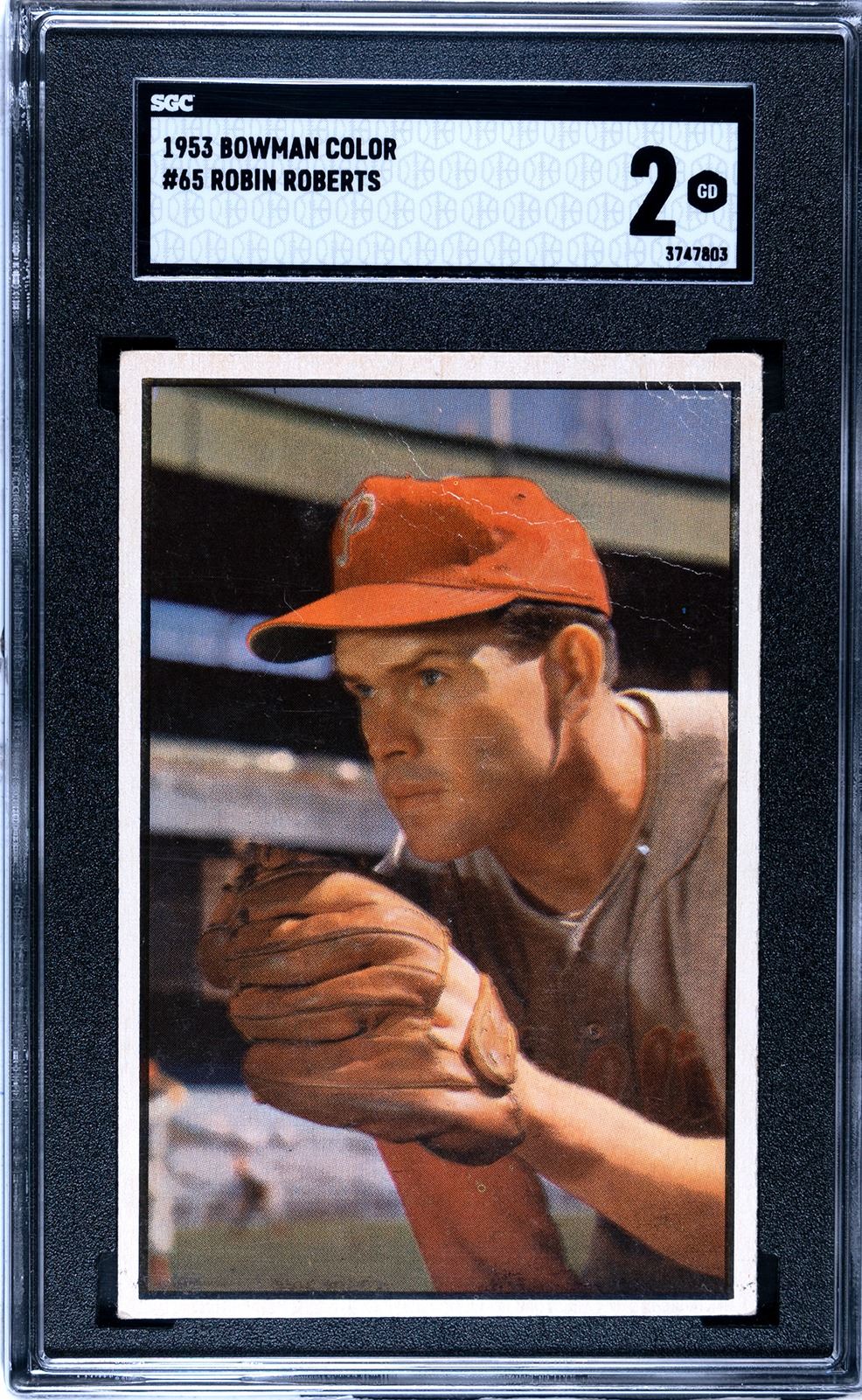 Off-grade example of HOFer Robin Roberts 53 Bowman Color offering. Roberts won 286 games, including a run of 6 straight 20+ win seasons in the early 50s. He was a workhorse who often led the league in games and innings pitched, and complete games. This one grades 2 GD by SGC.