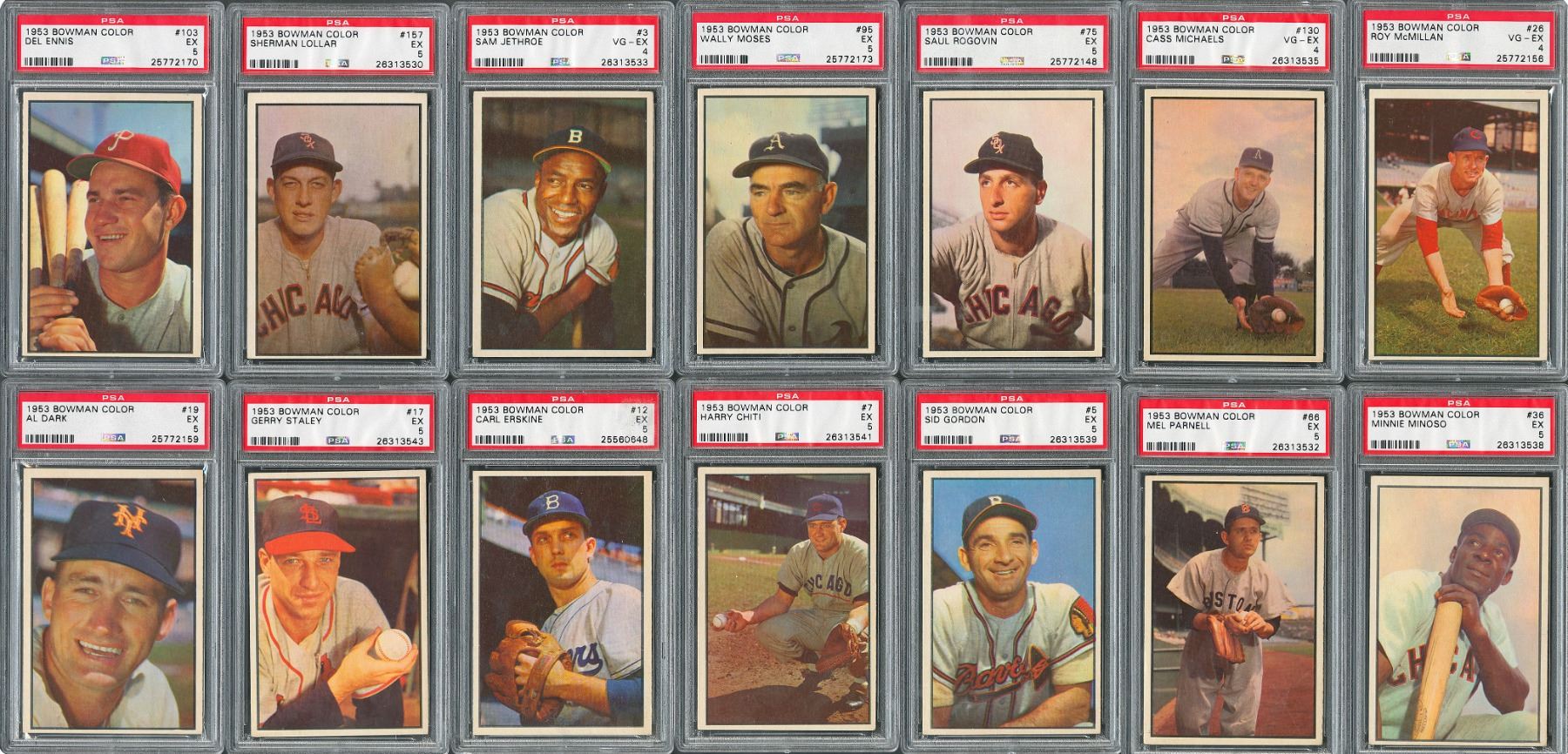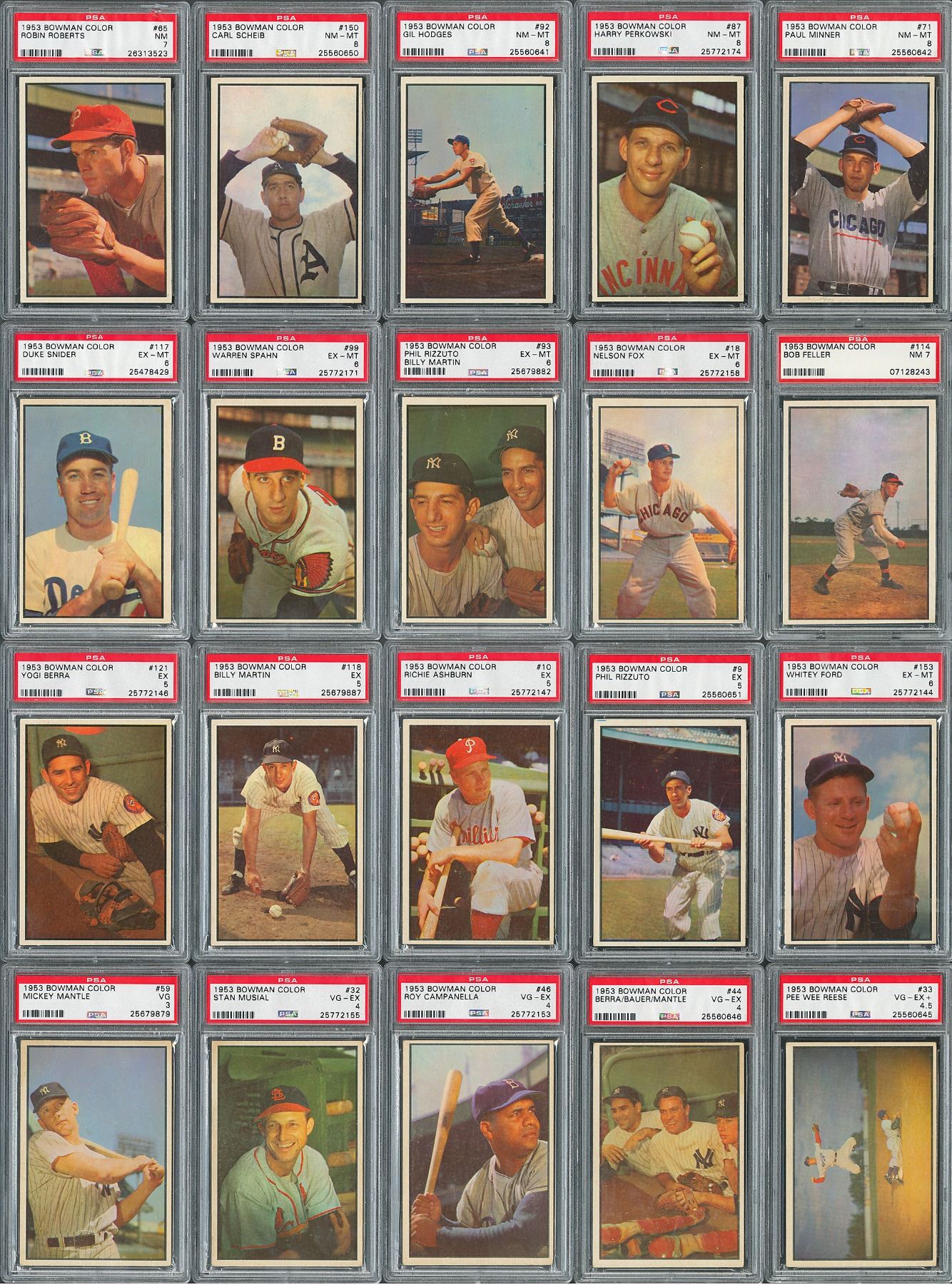 PSA EX 5: 18 cards with #1 Williams, 5, 7, 9 Rizzuto, 10 Ashburn, 12 Erskine, 17, 19, 36 Minoso, 40 Doby, 66 Parnell, 75, 81 Slaughter, 95, 103, 118 Martin, 121 Berra, and 157.