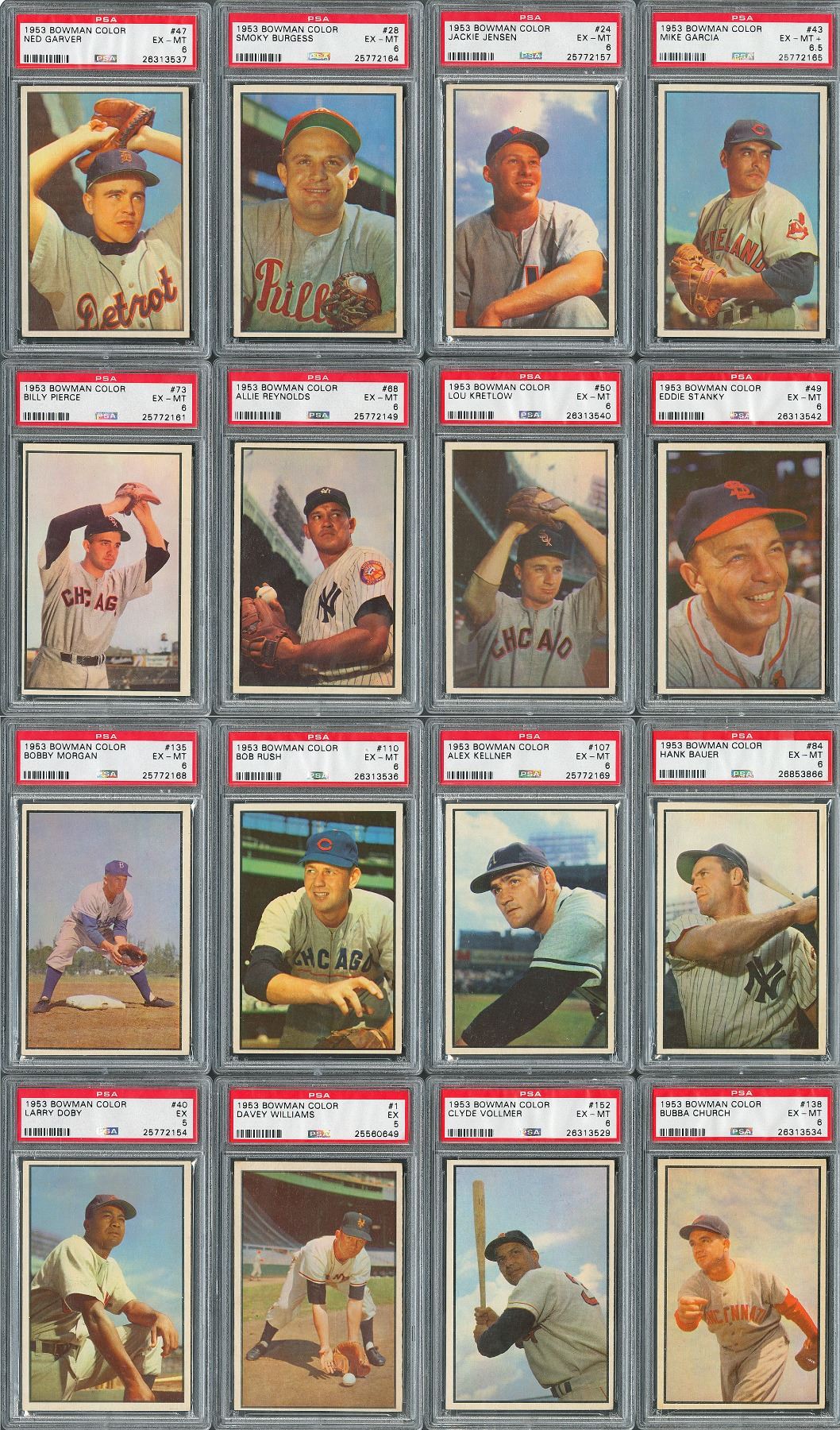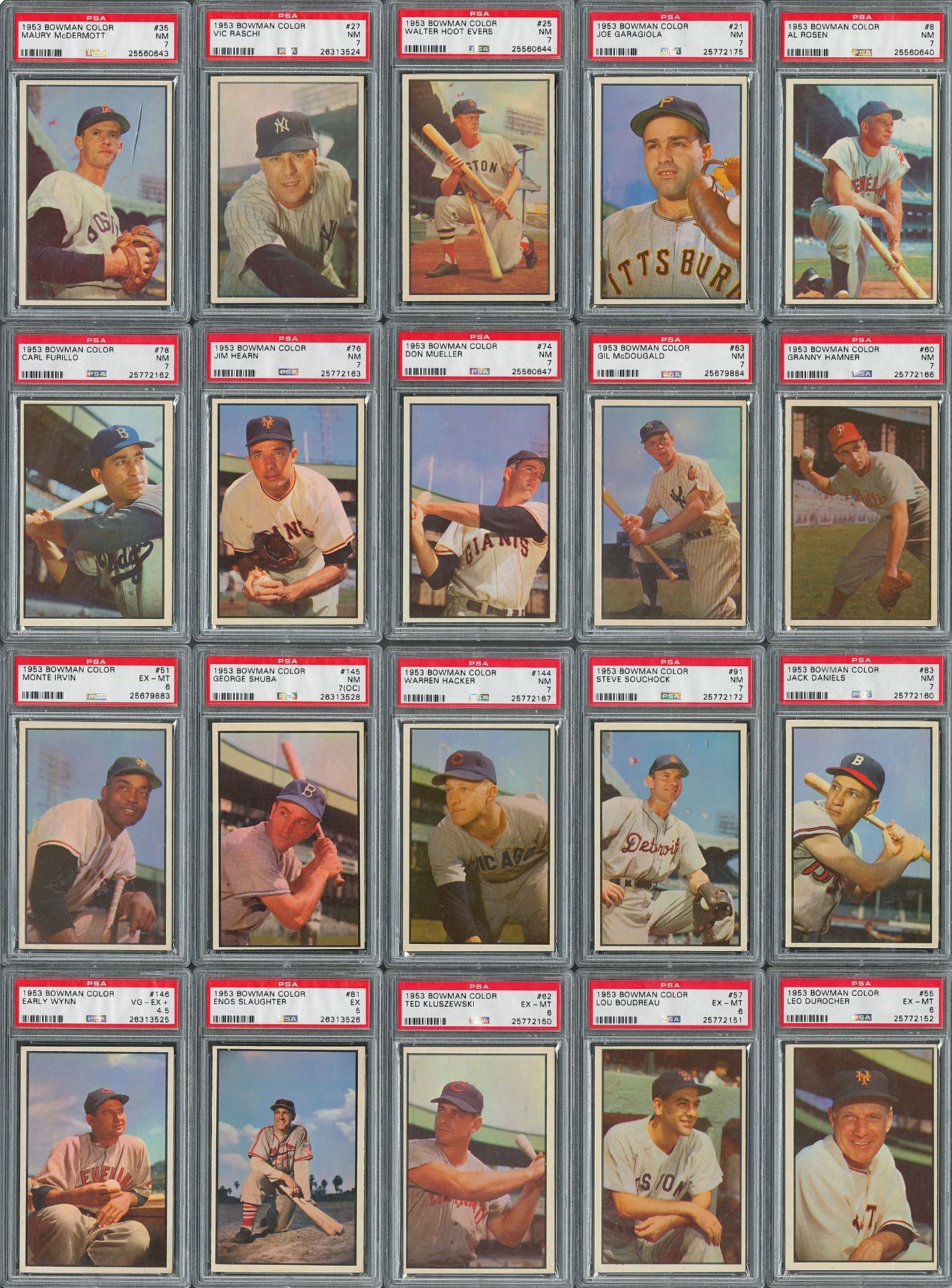 PSA EX-MT 6: 22 cards with #18 Fox, 24, 28, 47, 49, 50, 51 Irvin, 55 Durocher, 57 Boudreau, 62 Kluszeswki, 68 Reynolds, 73, 84 Bauer, 93 Rizzuto/Martin, 99 Spahn, 107, 110, 117 Snider, 135, 138, 152, and 153 Ford.