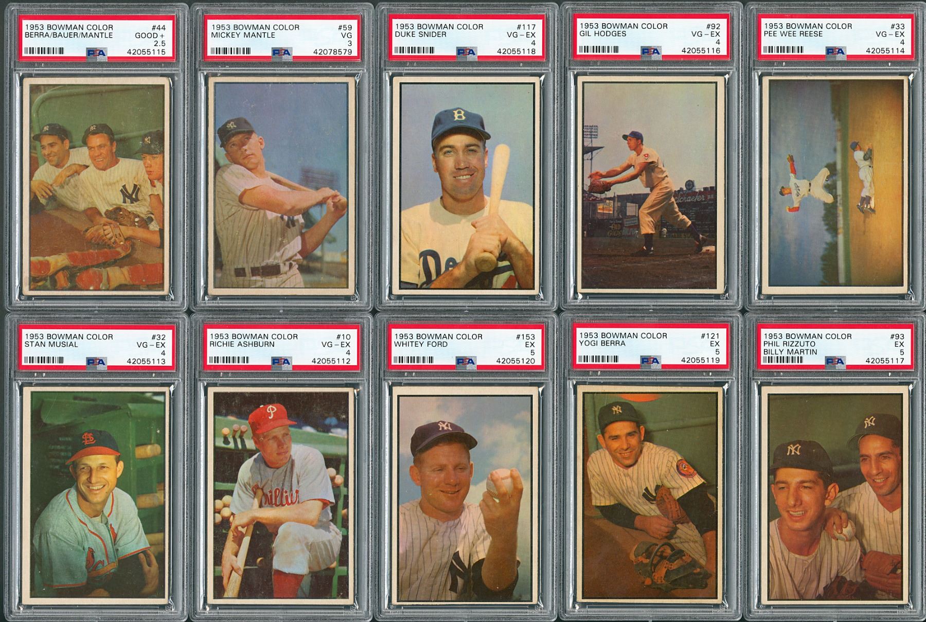 Includes: Graded Cards (10) - PSA EX 5: 3 cards w/ #93 Rizzuto/Martin, 121 Berra and 153 Ford. PSA VG-EX 4: 5 cards w/ #10 Ashburn, 32 Musial, 33 Reese, 92 Hodges and 117 Snider. PSA VG 3: 1 card, #59 Mantle. PSA GOOD+ 2.5: 1 card, #44 Berra/Bauer/Mantle.