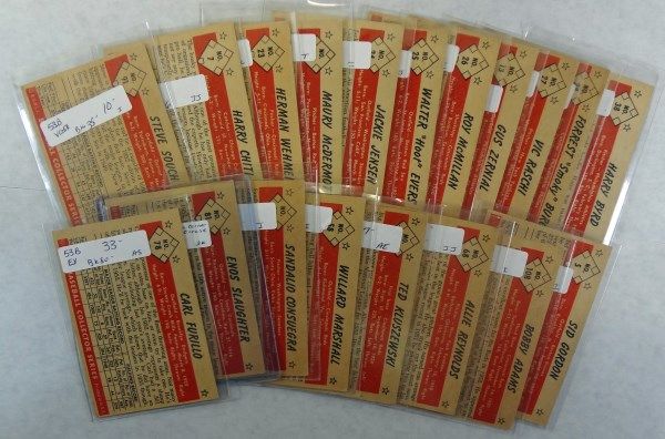 #5 Gordon, #7 Chiti, #13 Zernial, #23 Wehmeier, #24 Jensen, #25 Evers,#26 McMillan, #27 Raschi, #28 Burgess, #38 Byrd, #35 McDermott, #58 Marshall, #62 Kluszewski, #68 Reynolds, #78 Furillo, #81 Slaughter, #89 Consuegra, #91 Souchock, #108 Adams NICE VGEX+ to EX, No creasing Book $980