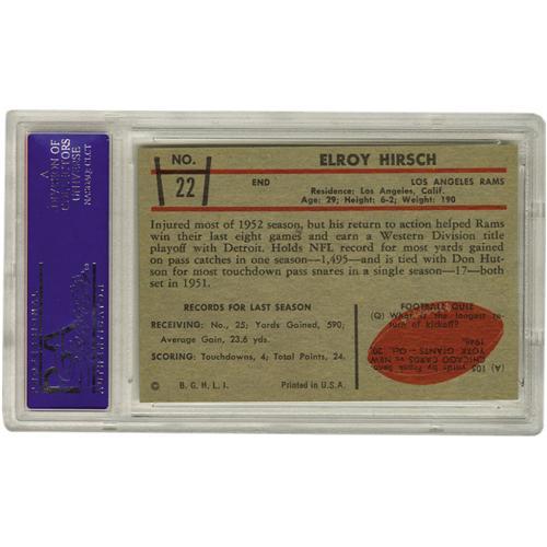 <B>1953 Bowman Elroy Hirsch #22 PSA Mint 9.</B></I> Only four specimens can match the brilliance of this pack-fresh Crazylegs card on PSA's population chart, with none ever soaring higher. Color and registration are first rate, centering is rendered with mathematical precision, and the corners are so sharp they could draw blood. Definitely the finest example on the market.