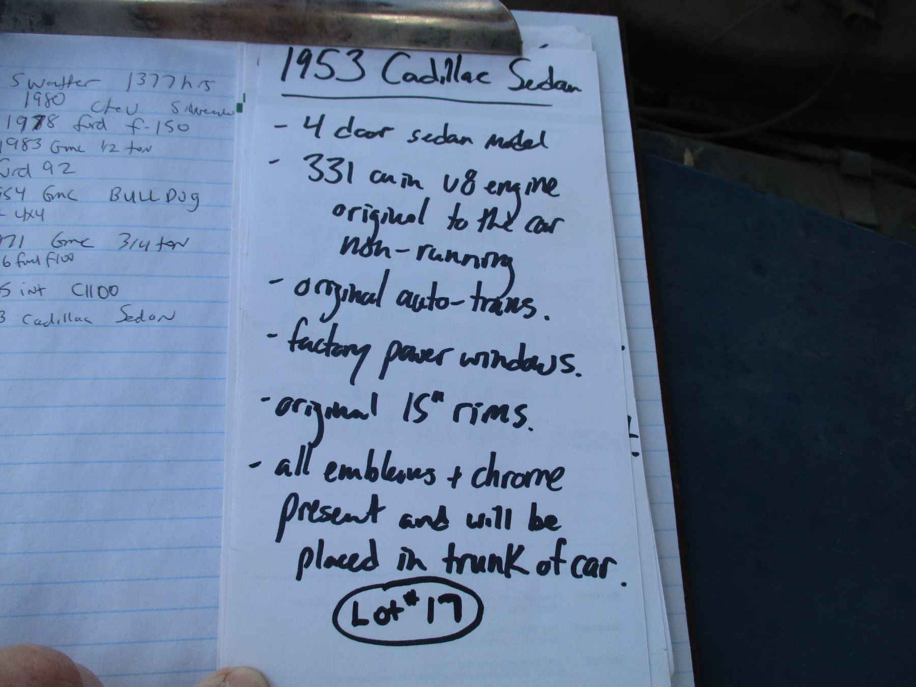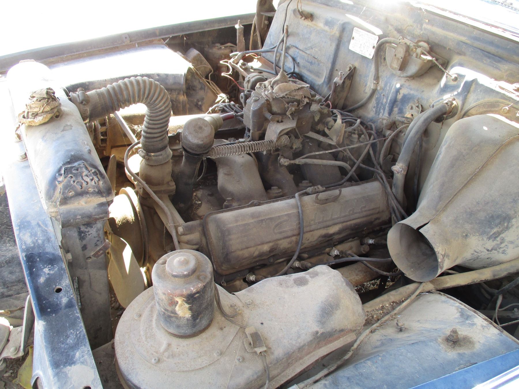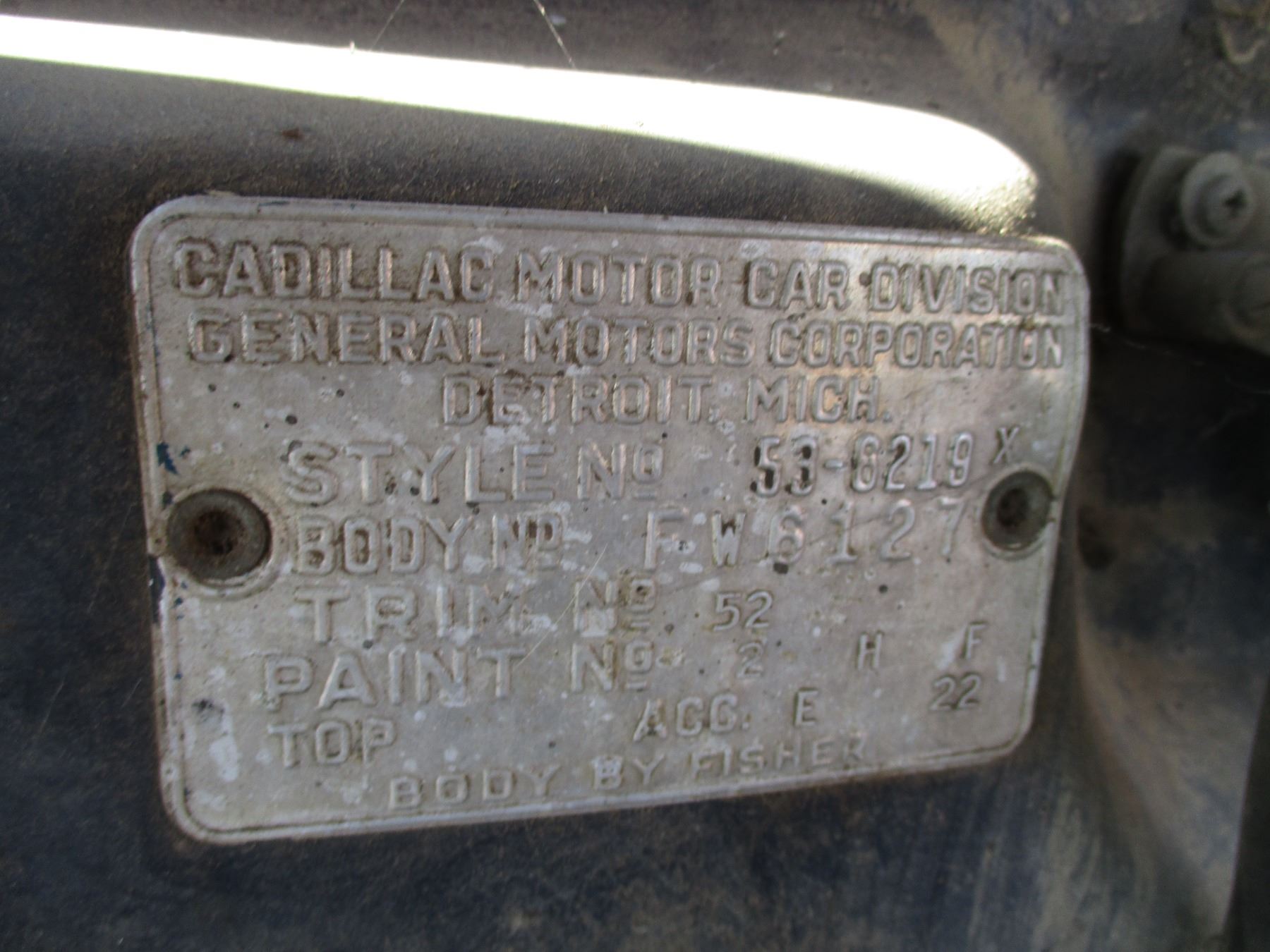 1953 Cadillac Sedan - 4 door - 331 cu in V8 original to the car (non-running) - original automatic trans, factory power windows, original 15" rums, all chrome + emblems present (in trunk of car)
