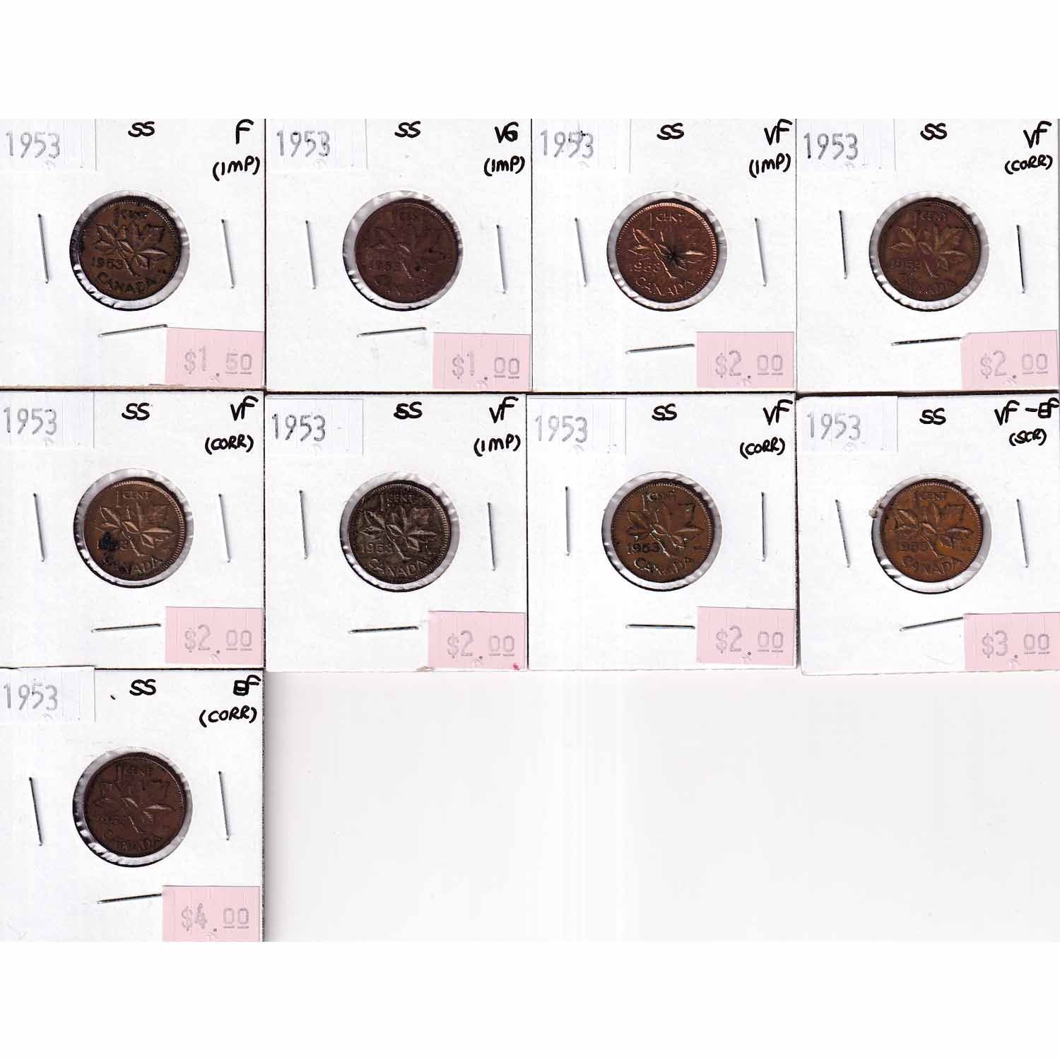 1953 Canada 1-cents SS Collection in Very Good to Extra Fine Condition (impaired). 9pcs