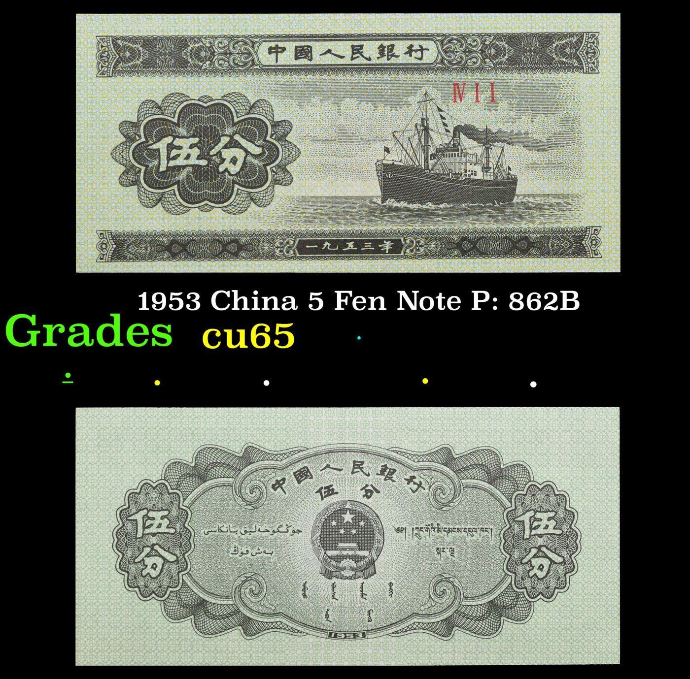 1953 China 5 Fen Note P: 862B Grades Gem CU.