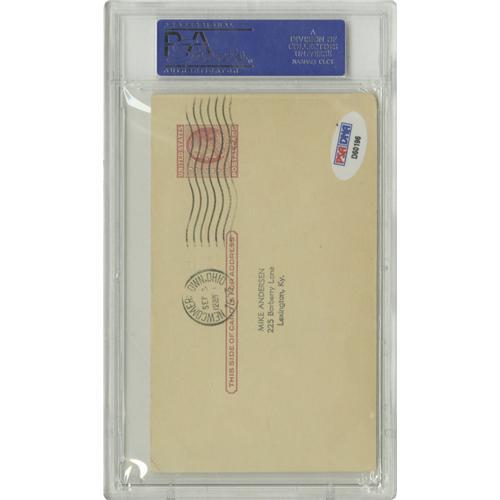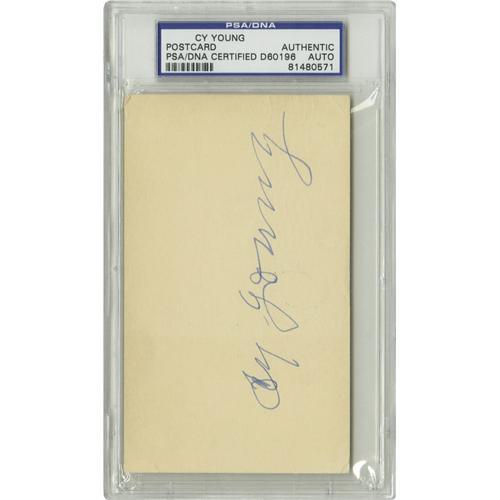 <B>1953 Cy Young Signed Government Postcard.</B></I> Just two years before the baseball world lost its most victorious pitcher, Young returned this postcard to an autograph seeker with his 10/10 blue ink signature. The postmark notes that the card was returned from Young's Newcomerstown, Ohio hometown, and only touches at the corners tell the tale of a half century of life. Slabbed by PSA/DNA for protection and unquestioned authenticity. <BR><BR><B>Important notice:</B> Heritage usually auctions material at the rate of 200-250 lots per hour. On some occasions eBay Live bid software or the Internet may not be able to keep up with the pace of the auction. We recommend placing a realistic absentee bid now as insurance to avoid disappointment. Occasionally the auctioneer may eliminate or reject an eBay Live bid, and the auctioneer may also reopen a lot after the close of the eBay live bidding (usually because we missed an audience bid), and may reject your bid even if it shows you as the winning bidder. By bidding via eBay Live, you agree that Heritage may award the lot to another bidder at its sole discretion under the circumstances described above or any other reasonable circumstances. Since eBay bids are not shown to us until we open the lot on the floor, we treat those bids just like floor bids. In most cases the floor responds before the eBay bid is presented to us, due to Internet lag time, so for consistency we have made it a policy that floor bids are always considered first over tie eBay live bids. Also please note that all Heritage lots purchased through eBay Live carry a 22.5% Buyer's Premium. Please make sure you read the Terms and Conditions before you bid. This lot is being auctioned in conjunction with a live floor auction by Heritage Galleries & Auctioneers. All final auction and invoice information will be supplied by Heritage Galleries & Auctioneers, and all other information should be considered preliminary. Lot:19092 <BR><BR><B>Winning Notification and Billing:</B> After the FINAL session in this auction is complete, Heritage will send e-mail and snail mail invoices. This process normally takes several days. All final auction and invoice information will be supplied by Heritage Galleries & Auctioneers, and all other information should be considered preliminary. <BR><BR>This auction will be conducted on a live auction floor and over the Internet through eBay Live. If you choose to place an absentee bid, please take a moment to <font color='#0000ff'><u><a href='http://pages.ebay.com/liveauctions/help/before/laabsentee.html'>learn how eBay Live absentee bidding works</a></u></font><font color='#000000'>