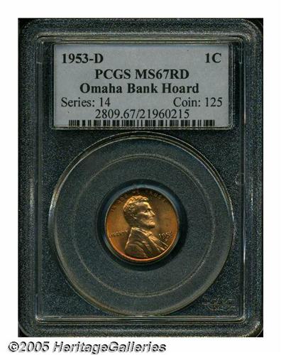 <B>1953-D<1C> MS67 Red PCGS.</B></I> Ex: Omaha Bank Hoard. A gorgeous orange-red Superb Gem, lustrous and essentially unabraded. A solitary fleck above the left wheat stem identifies this lovely piece. Population: 9 in 67, 0 finer (4/05).