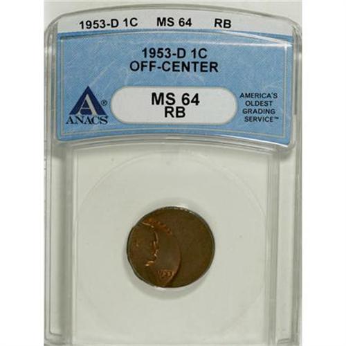 <B>1953-D 1C Cent--Off Center--MS64 Red and Brown ANACS.</B></I><BR><BR><B>Coin Engraver:</B> Victor D. Brenner<BR><BR><b>Shipping:</b> Coins & Currency (<a target="_blank" href="http://www.heritageauctions.com/common/shipping.php">view shipping information</a>)