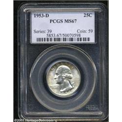<table><tr><td><TABLE cellSpacing=0 cellPadding=0 width="100%" bgColor=#000000 border=0><TBODY> <TR><TD width="100%"><TABLE cellSpacing=1 cellPadding=3 width="100%" border=0><TBODY><TR><TD width="100%" bgColor=#79735c><FONT face=arial color=#ffffff size=3><B>Description</B> </FONT></TD></TR><TR><TD width="100%" bgColor=#ffffff><FONT face=arial size=2><B>1953-D 25C MS67 PCGS.</B></I> The 1953-D is another high mintage issue, with more than 56 million pieces produced. However, in Superb condition PCGS has only certified eight other coins with none finer at either of the major services (7/03). While this coin is noticeably clean and problem-free, its strong suite is the thick mint frost that rolls around each side as it is slowly tilted beneath a light. The centers of each side are brilliant while the margins are framed in rich brown tones. </FONT></TD></TR></TBODY></TABLE></TD></TR></TBODY></TABLE><BR><A name=PricesRealized></A><TABLE cellSpacing=0 cellPadding=0 width="100%" bgColor=#000000 border=0><TBODY><TR><TD width="100%"><TABLE cellSpacing=1 cellPadding=3 width="100%" border=0><TBODY><TR><TD width="100%" bgColor=#79735c><A name=PR><FONT face=arial color=#ffffff size=3><B>Previous Prices from Heritage Auctions</B> </FONT></A></TD></TR><TR><TD bgColor=#f6f6ed><TABLE cellSpacing=0 cellPadding=0 width="100%" border=1><TBODY><TR><TD align=middle width="33%"><B>Date</B></TD><TD align=middle width="33%"><B>Service</B></TD><TD align=middle width="33%"><B>Price</B></TD></TR><TR bgColor=whitesmoke><TD width="33%"><B>01/21/2003</B></TD><TD width="33%">NGC</TD><TD width="33%">$368.00</TD></TR><TR bgColor=whitesmoke><TD width="33%"><B>05/03/2003</B></TD><TD width="33%">NGC</TD><TD width="33%">$431.25</TD></TR><TR bgColor=whitesmoke><TD width="33%"><B>01/13/2003</B></TD><TD width="33%">NGC</TD><TD width="33%">$1,955.00</TD></TR><TR bgColor=whitesmoke><TD width="33%"><B>04/07/2001</B></TD><TD width="33%">NGC</TD><TD width="33%">$299.00</TD></TR></TBODY></TABLE></TD></TR><TR><TD bgColor=#ffffff><FONT face=arial size=1 ?>PLEASE NOTE: All prices realized reflect the final hammer price PLUS the buyer's premium in auctions that charge a buyer's premium. Each item has a notation at the top of the listing indicating whether that lot included a buyer's premium. Example: A item that sells with a final hammer price of $100 and a 20% buyer's premium will display with a price realized of $120. All information listed is intended to be as accurate as possible, but errors are possible. Please use this guide carefully and inform us of any inaccuracies. </FONT></TD></TR></TBODY></TABLE></TD></TR></TBODY></TABLE><BR><TABLE cellSpacing=0 cellPadding=0 width="100%" bgColor=#000000 border=0><TBODY><TR><TD width="100%"><TABLE cellSpacing=1 cellPadding=3 width="100%" border=0><TBODY><TR><TD width="100%" bgColor=#79735c colSpan=6><FONT face=arial color=#ffffff size=3><B>Price Guide*</B> </FONT></TD></TR><TR bgColor=#f6f6ed><TD align=middle><B>Grade</B> </TD><TD align=middle><B>Coin World<BR>(Trends)</B> </TD><TD align=middle><B>Numismedia<BR>Retail</B> </TD><TD align=middle><B>Numismedia<BR>Wholesale</B> </TD><TD align=middle><B>Coin<BR>Universe</B> </TD><TD align=middle><B>Heritage<BR>Value Index</B> </TD></TR><TR bgColor=#ffffff><TD align=middle>66</TD><TD align=right>---</TD><TD align=right>$96.00</TD><TD align=right>$77.00</TD><TD align=right>$135.00</TD><TD align=right>$122.00</TD></TR><TR style="FONT-WEIGHT: bold" bgColor=#cccfdd><TD align=middle>67</TD><TD align=right>---</TD><TD align=right>$600.00</TD><TD align=right>$480.00</TD><TD align=right>---</TD><TD align=right>---</TD></TR><TR bgColor=#ffffff><TD align=middle>68</TD><TD align=right>---</TD><TD align=right>---</TD><TD align=right>---</TD><TD align=right>---</TD><TD align=right>---</TD></TR><TR bgColor=#ffffff><TD colSpan=6><FONT size=1>*All information listed is intended to be as accurate as possible, but errors are possible. No item may be returned or refused based on this information which is provided as a service to our customers. You should contact each pricing source directly to determine the accuracy of this information. </FONT></TD></TR></TBODY></TABLE></TD></TR></TBODY></TABLE><BR><TABLE cellSpacing=0 cellPadding=0 width="100%" bgColor=#000000 border=0><TBODY><TR><TD width="100%"><TABLE cellSpacing=1 cellPadding=3 width="100%" border=0><TBODY><TR><TD width="100%" bgColor=#79735c><FONT face=arial color=#ffffff size=3><B>Population Guide</B> </FONT></TD></TR><TR bgColor=#ffffff><TD align=middle><!-- Begin Output of Population Grid--><TABLE cellSpacing=0 cellPadding=0 width="100%" border=0><TBODY><TR><TD vAlign=center><TABLE cellSpacing=0 width="100%" border=1 cellsadding="3"><TBODY><TR><TD vAlign=center><TABLE cellSpacing=0 cellPadding=3 width="100%" border=1><TBODY><TR><TD vAlign=center align=middle bgColor=#f0f1e8 colSpan=2 <CENTER><FONT face=Arial size=2><B>PCGS Pop </B></FONT><CENTER></CENTER></TD><TD vAlign=center align=middle bgColor=#f0f1e8 colSpan=2><CENTER><FONT face=Arial size=2><B>NGC Pop</B></CENTER></FONT></TD></TR><TR><TD vAlign=center><FONT face=Arial size=2>(67)</FONT> </TD><TD vAlign=center align=right><FONT face=Arial size=2>11</FONT> </TD><TD vAlign=center><FONT face=Arial size=2>(67)</FONT> </TD><TD vAlign=center align=right><FONT face=Arial size=2>49</FONT> </TD></TR><TR><TD vAlign=center><FONT face=Arial size=2>(>67)</FONT> </TD><TD vAlign=center align=right><FONT face=Arial size=2>0</FONT> </TD><TD vAlign=center><FONT face=Arial size=2>(>67)</FONT> </TD><TD vAlign=center align=right><FONT face=Arial size=2>0</FONT> </TD></TR></TBODY></TABLE></TD></TR></TBODY></TABLE></TD></TR></TBODY></TABLE><!-- End Output of Population Grid--></TD></TR></TBODY></TABLE></TD></TR></TBODY></TABLE><BR><TABLE cellSpacing=0 cellPadding=0 width="100%" bgColor=#000000 border=0><TBODY><TR> Important notice: Heritage usually auctions material at the rate of 200-250 lots per hour. On some occasions eBay Live bid software or the Internet may not be able 