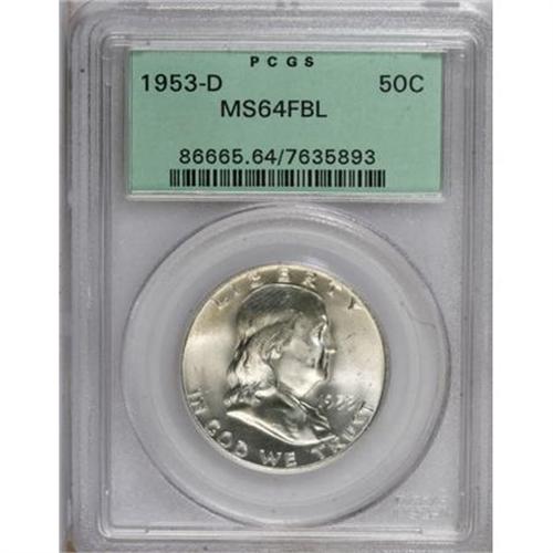 <B>1953-D 50C MS64 Full Bell Lines PCGS.</B></I> PCGS Population (2068/724). NGC Census: (333/233). Numismedia Wsl. Price for NGC/PCGS coin in MS64: $41. (#86665)<BR><BR><b>Shipping:</b> Coins & Currency (<a target="_blank" href="http://www.heritageauctions.com/common/shipping.php">view shipping information</a>)