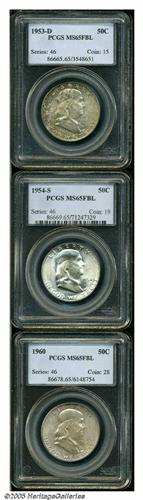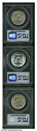 <B>1953-D<50C> MS65 Full Bell Lines PCGS,</B></I> mint set toning encompasses each side; <B>1954-S MS65 Full bell Lines PCGS,</B></I> bright and untoned with a minimum of marks; and a <B>1960 MS65 Full Bell Lines PCGS,</B></I> a pleasing mixture of rose and sky-blue toning blankets each side.<BR><I>From The Western Hills Collection.</B></I>
